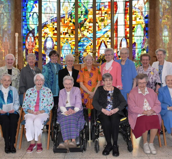 Seated: Sisters Martin de Porres Coleman (70 years) and Barbara (Ernest Marie) Matasci (70 years). Not present: Sisters Joan (Mary Joan) Maritz, (70 years), Mavourneen (Mary Arthur) McGinty (70 years), Carol (John Gregory) Miller (60 years) and Julie Marie Thorpe (70 years).